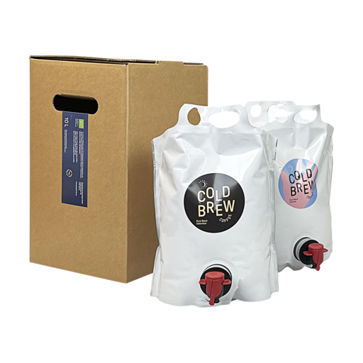 Bag-in-box means pretty much what it is: it is a plastic bag filled with a liquid (e.g. Cold Brew) in a cardboard box.